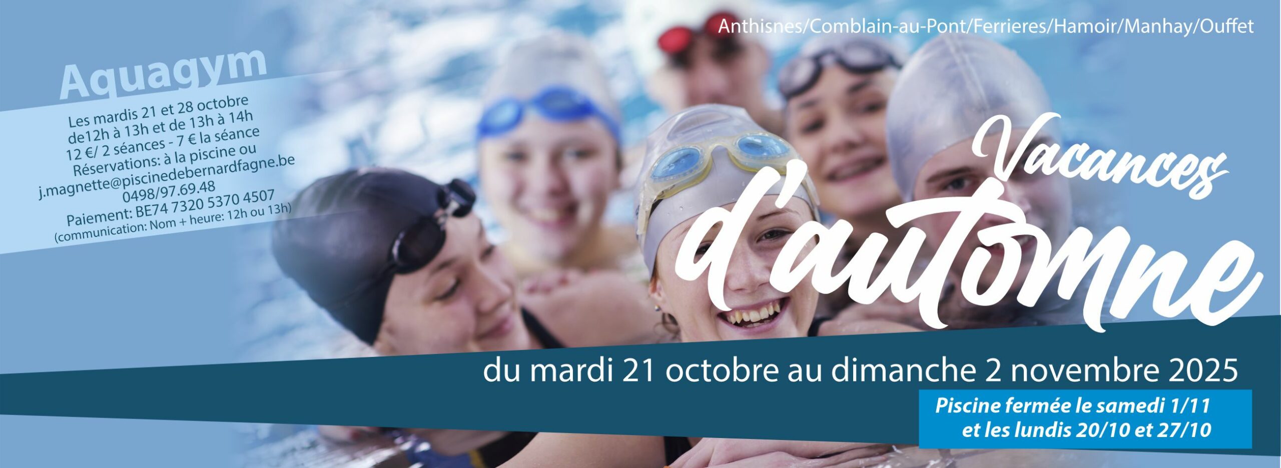 Accueil Quoi de neuf à la Piscine de Bernardfagne ? Vacances d’automne Réouverture suite aux problèmes techniques Vacances d’été 2025 Vacances de carnaval 2025 – ouvertures Fermeture pour les fêtes de fin d’année Ouvertures pendant les congés d’automne 2024 Ouvertures pendant les congés de printemps 2024 Ouvertures pendant les congés de détente 2024 Fermeture du 24/12/2023 au 06/01/2024 Aquagym – Inscrivez vous !